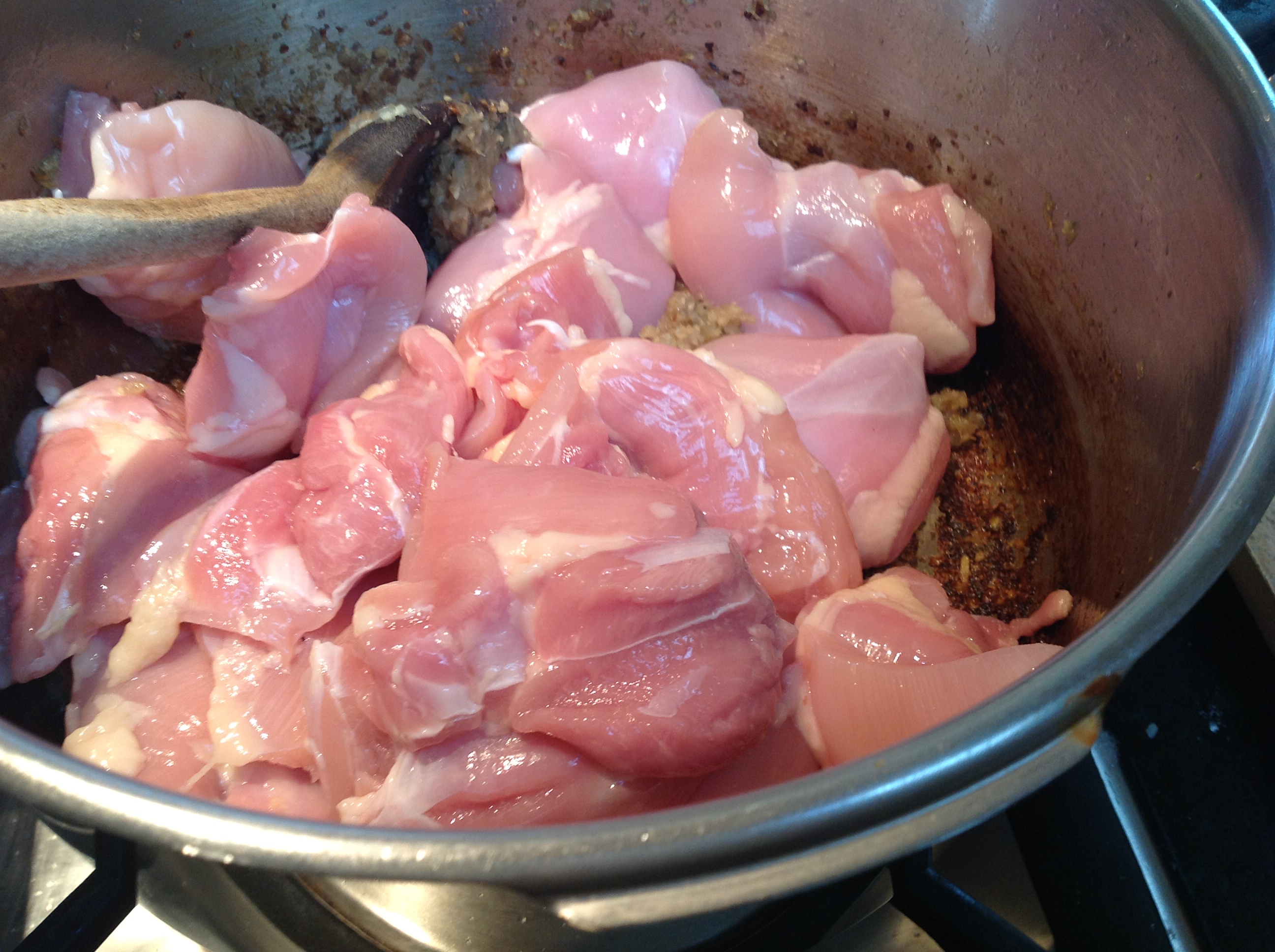 Put the chicken pieces in all at once, add some salt (more can come later), and 1 teaspoon turmeric. Stir to coat the chicken pieces with the spices and the oil mixture.