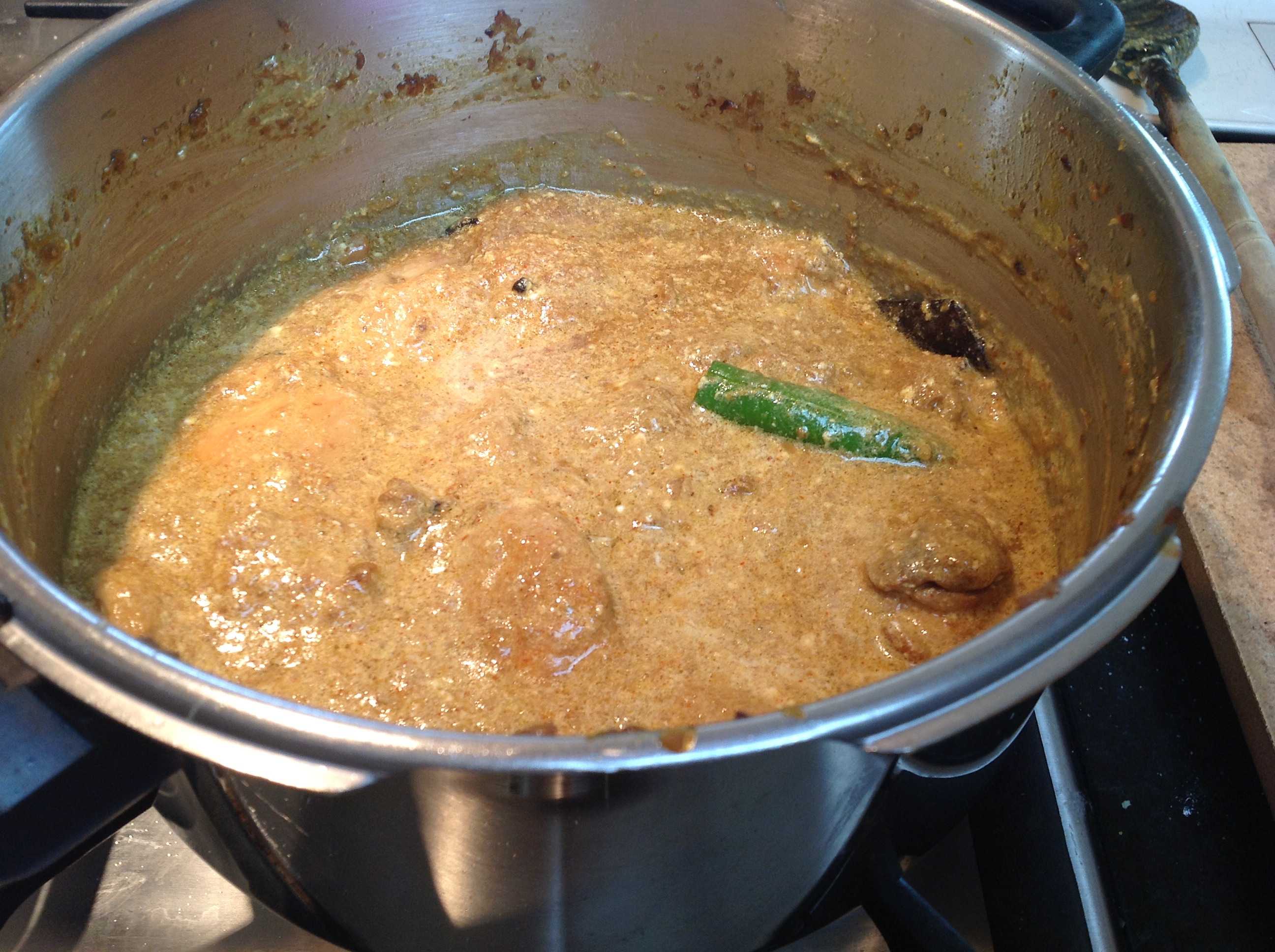 Now. This is important. We are not trying to sear the chicken. We are trying to get it to sweat out most of the liquid. In Western cooking, the standard technique is to quickly subject the surface of the meat to high heat; which creates a sear, and seals in the moisture keeping the meat moist. Not so in Indian curries. My mom taught me that one wants all the ‘chickeny liquid’ to be gone — so the idea is to keep cooking, stirring, pushing the pieces around; they will first become opaque as the protein is denatured; then, they will start to sweat and shrink. A luscious gravy will start to form around the shrunken chicken pieces. Keep it going for at least 20 minutes on medium heat.