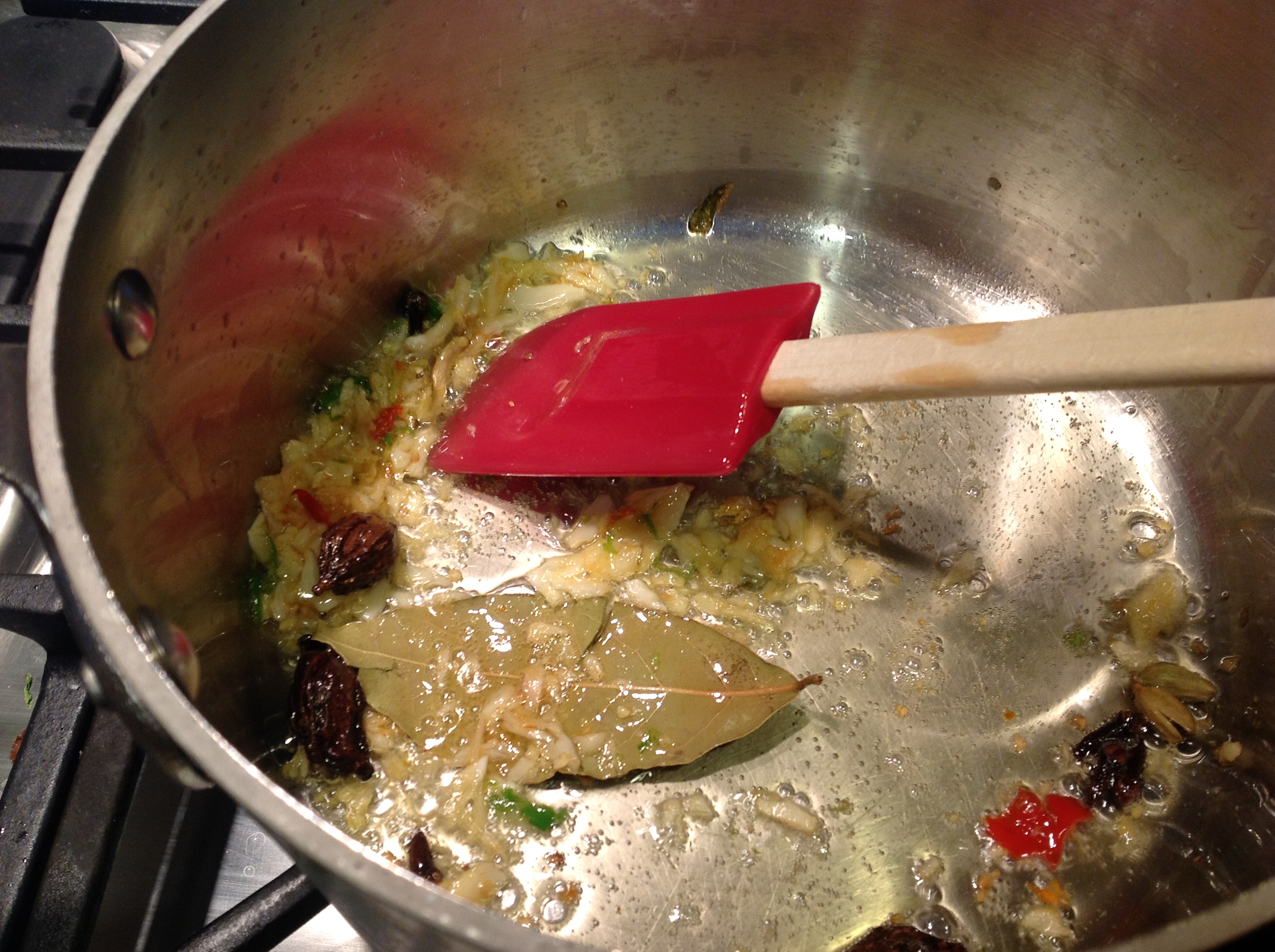 Heat the ghee in a thick-bottomed pot on medium heat. When fully melted, throw in the whole spices — the cloves, cardamoms, cinnamon, bay leaf. They need to cook for a minute, then in goes the ginger garlic paste. Let it sizzle and look ‘cooked’ which is one step before looking ‘browned’. At this point put in the tomato puree and an additional cup of water.