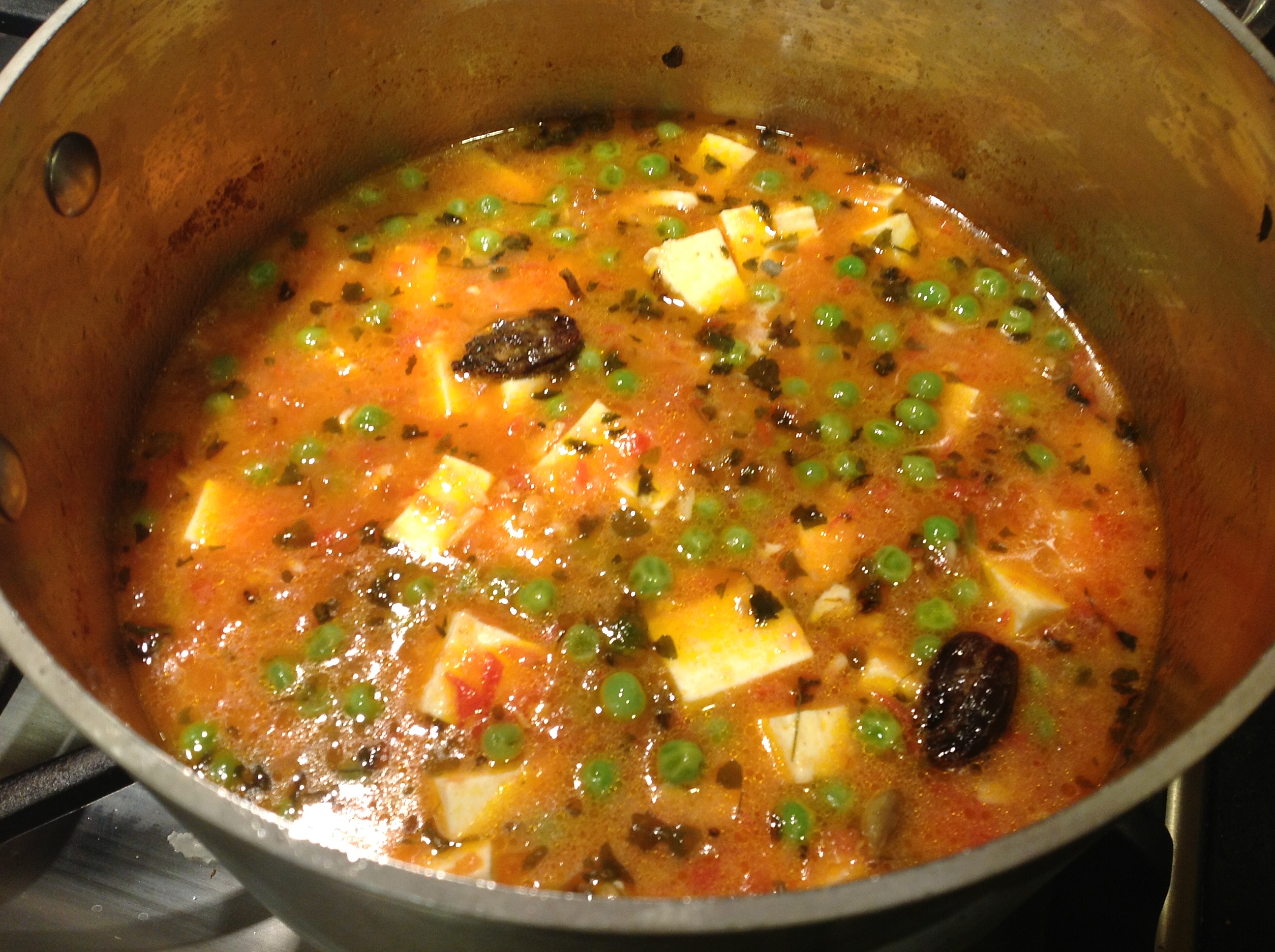 Now the jewels go in. There is no need to thaw the peas before adding them in. The peas can go in first, then the cubed paneer. If you have other ‘jewels’ that need to be cooked to fully enjoy them, I suggest you precook them by blanching or microwaving, with some salt, before popping them into the sauce to finish off.