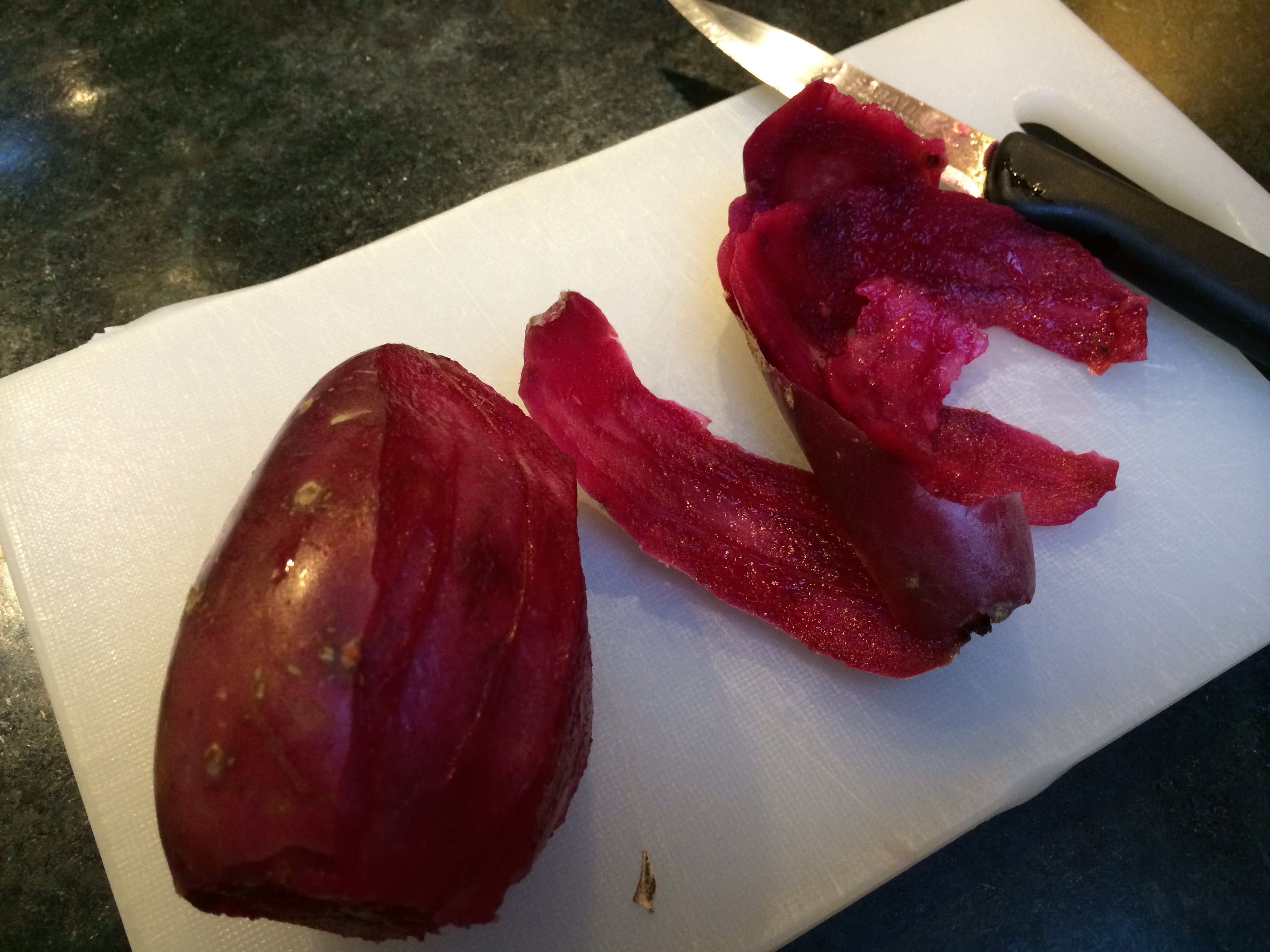 The way one eats it is — first, before all else, remove the spines. Now this was already done for me at the market, and if you are lucky this is how you will find the fruit sold. Next, peel off the outer thick peel, which comes off quite easily with a paring knife.