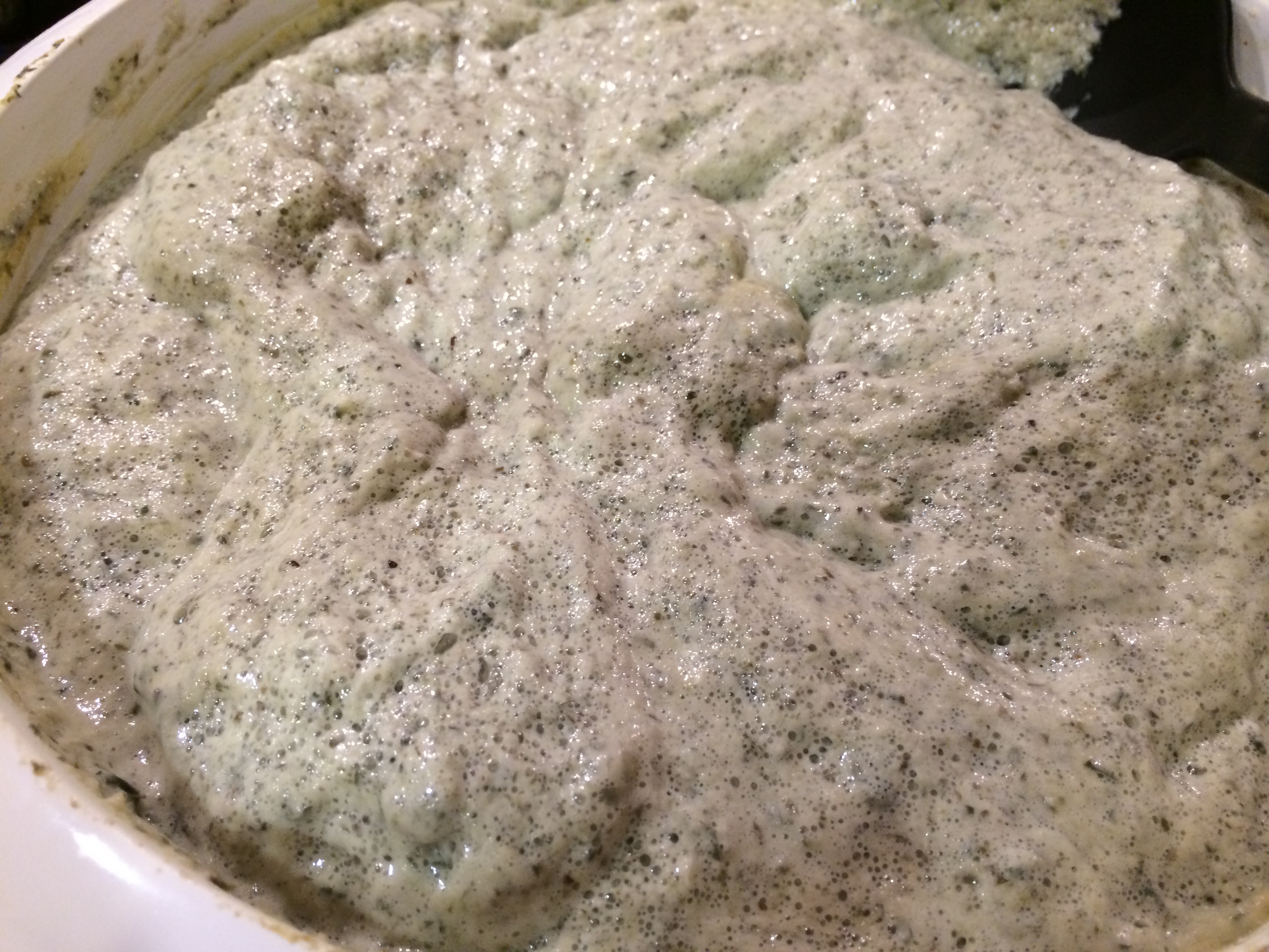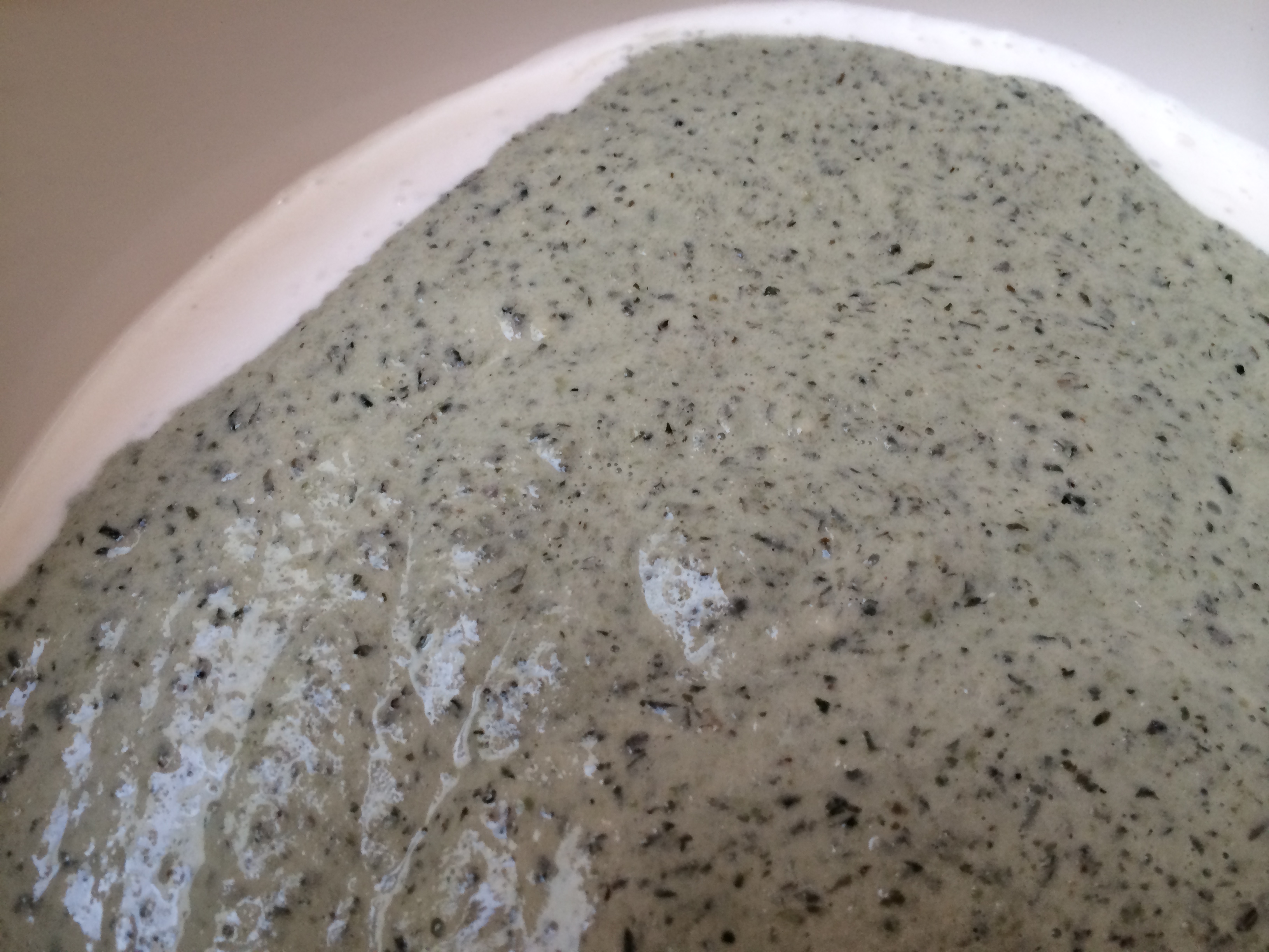 In about 12 hours I raised the lid to take a whiff — oof! Wet socks, toe jam, belly button cheese…not sure what else it reminded me of. Clearly, my batter had developed a yeast infection. Be not squeamish, ye of little faith! Put the lid down and keep going.