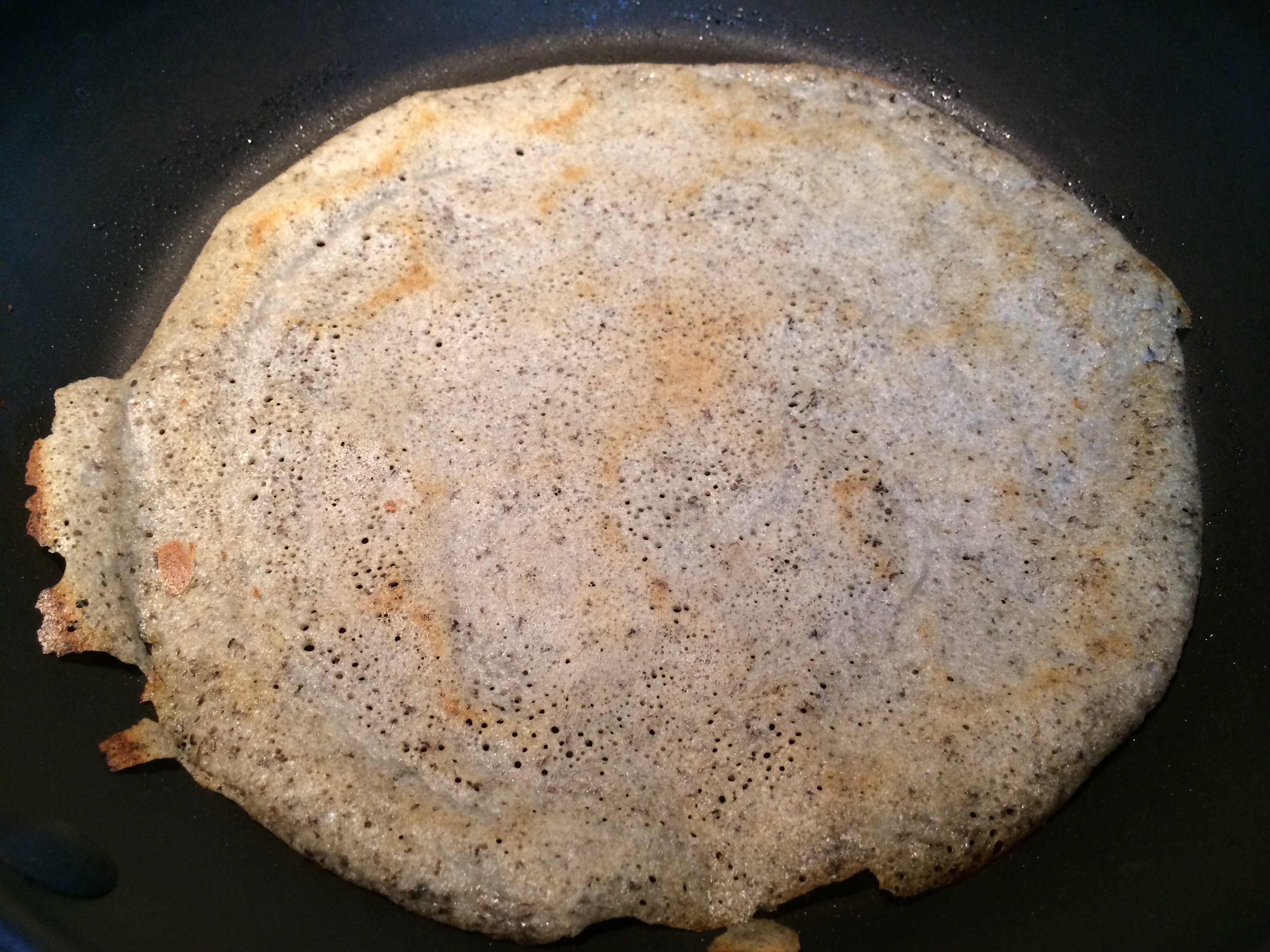 • If you pour batter on to a hot pan, it will immediately congeal and instead of spreading, you will get a rubbery mass. So the pan needs to be hot while cooking, but cool while pouring on. Traditionally people have used the onion trick — rub half a cut onion on the pan to cool it down. I used the French way of lifting it off the flame as I pour the batter on.