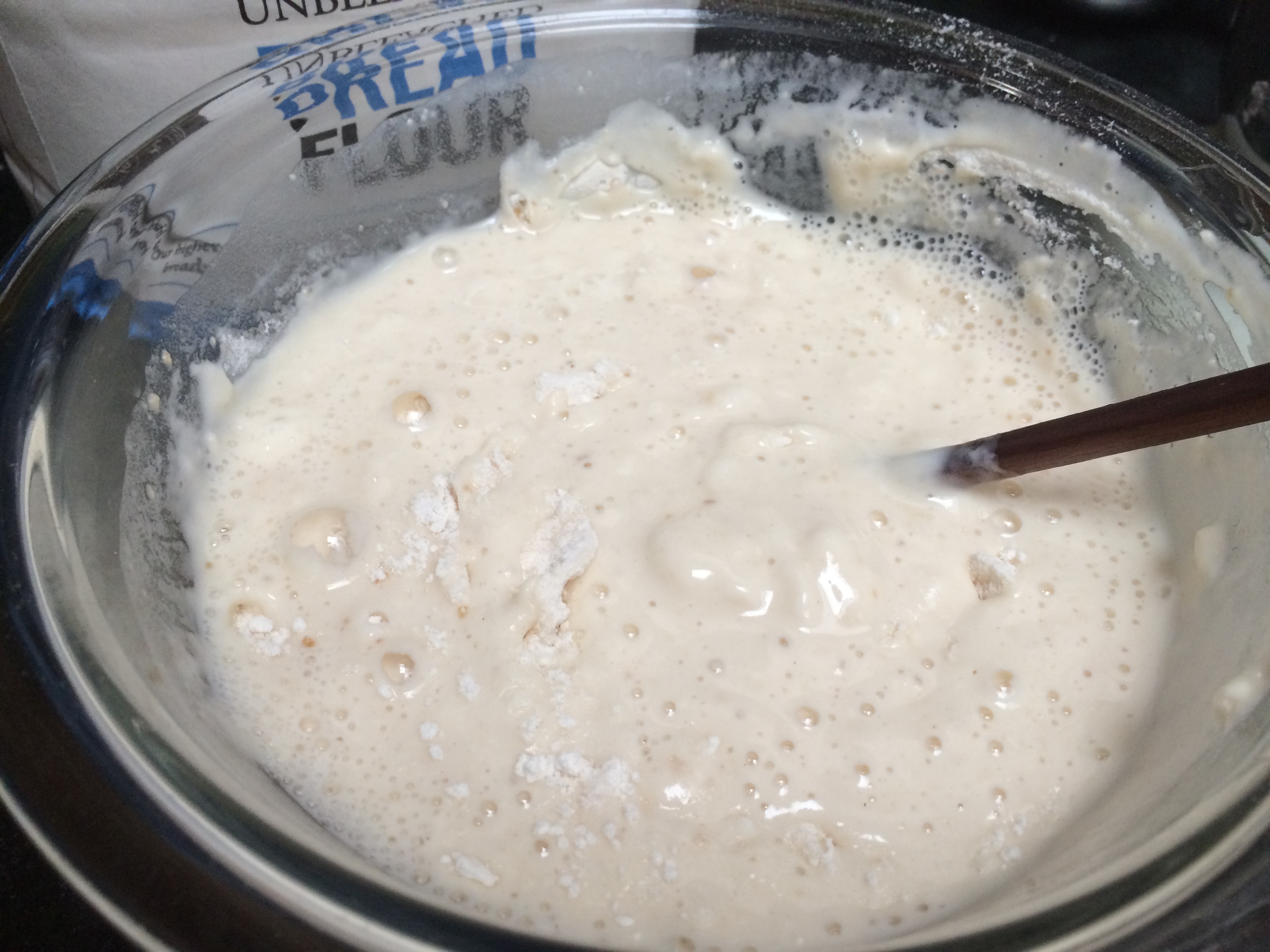 Mix the dry ingredients together in a bowl, then pour in the water (remember to use 1/4 cup of the raisin water for added flavor), and stir stir stir with a wooden spoon or chopstick, almost like you are whisking it. The sponge will look like batter with some air incorporated into it. Cover with a plastic wrap and keep aside at room temperature for at least 1.5 hours, at most a whole day.