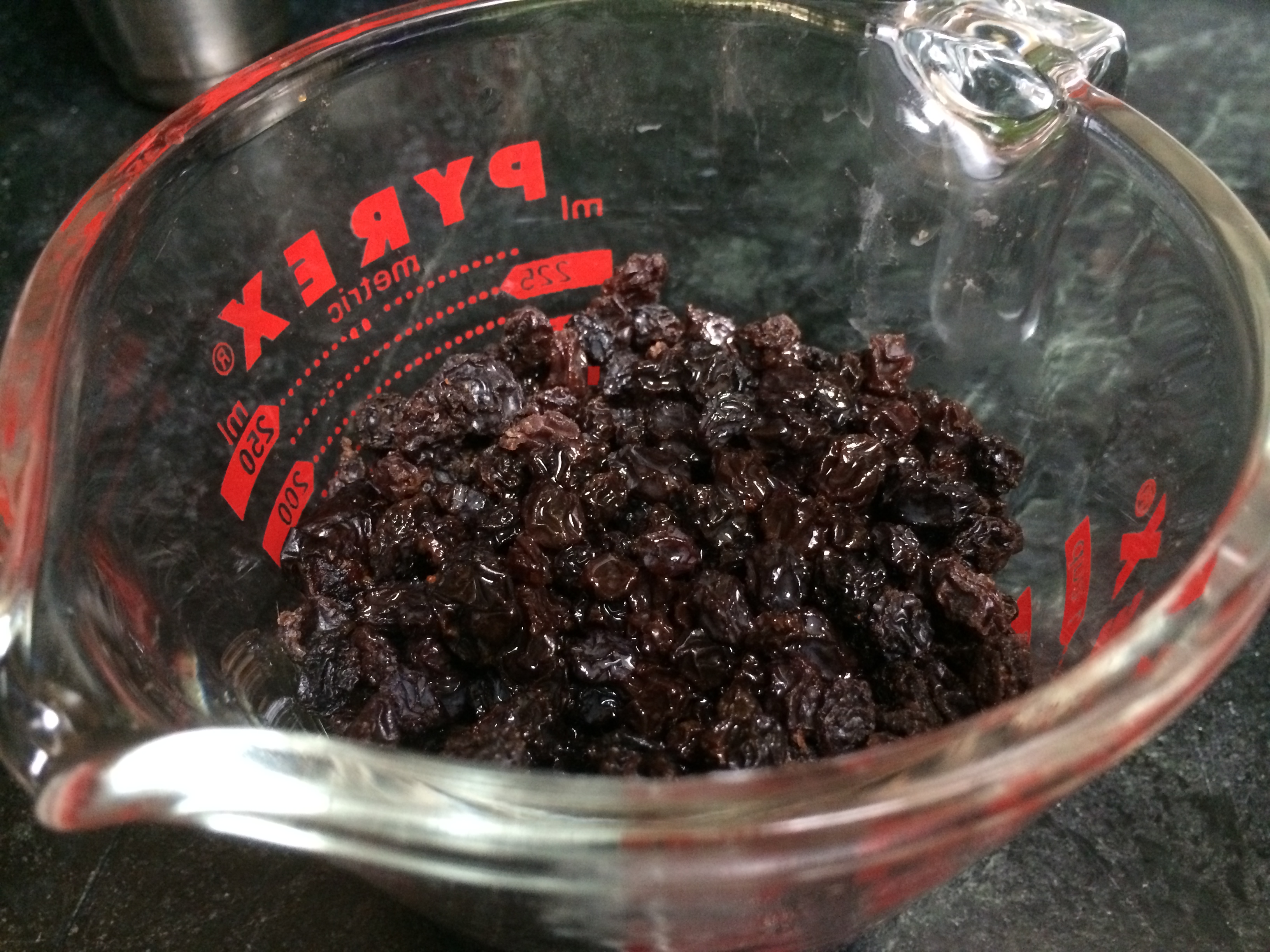 Soak the raisins in hot water for half an hour. At this point, drain the raisins and you will be left with 1/4 cup water, that you can use to make the sponge below.
