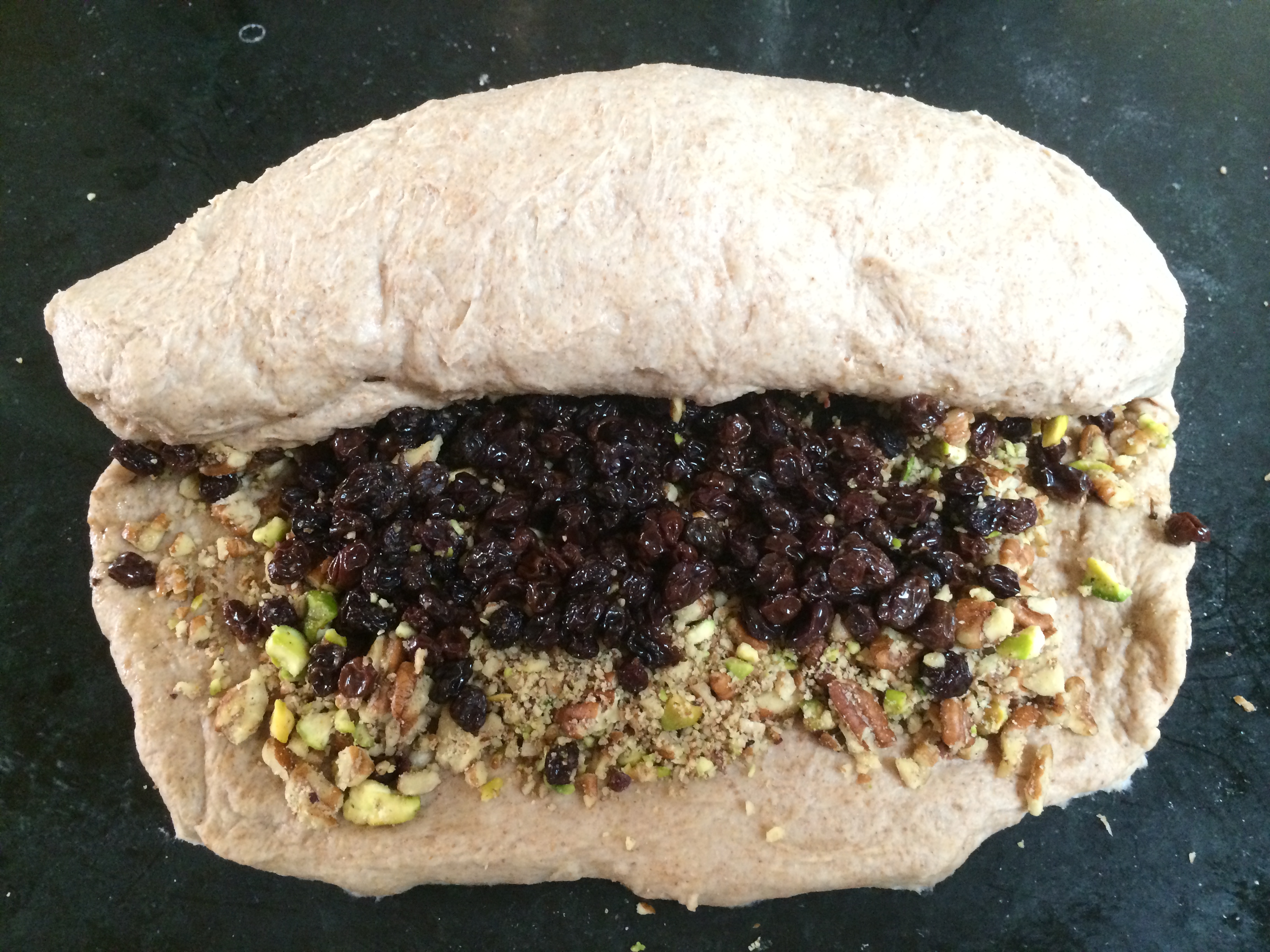 Now flatten the dough and spread it out into a rough rectangle about 10 inches by 15 inches. Spread the broken pecans bits all over the rectangle leaving an inch border on all sides. Then spread the raisins over the same area evenly. Start rolling up the dough from a short end, also taking care to tuck in the edges. All the nuts and raisins will be hidden inside.