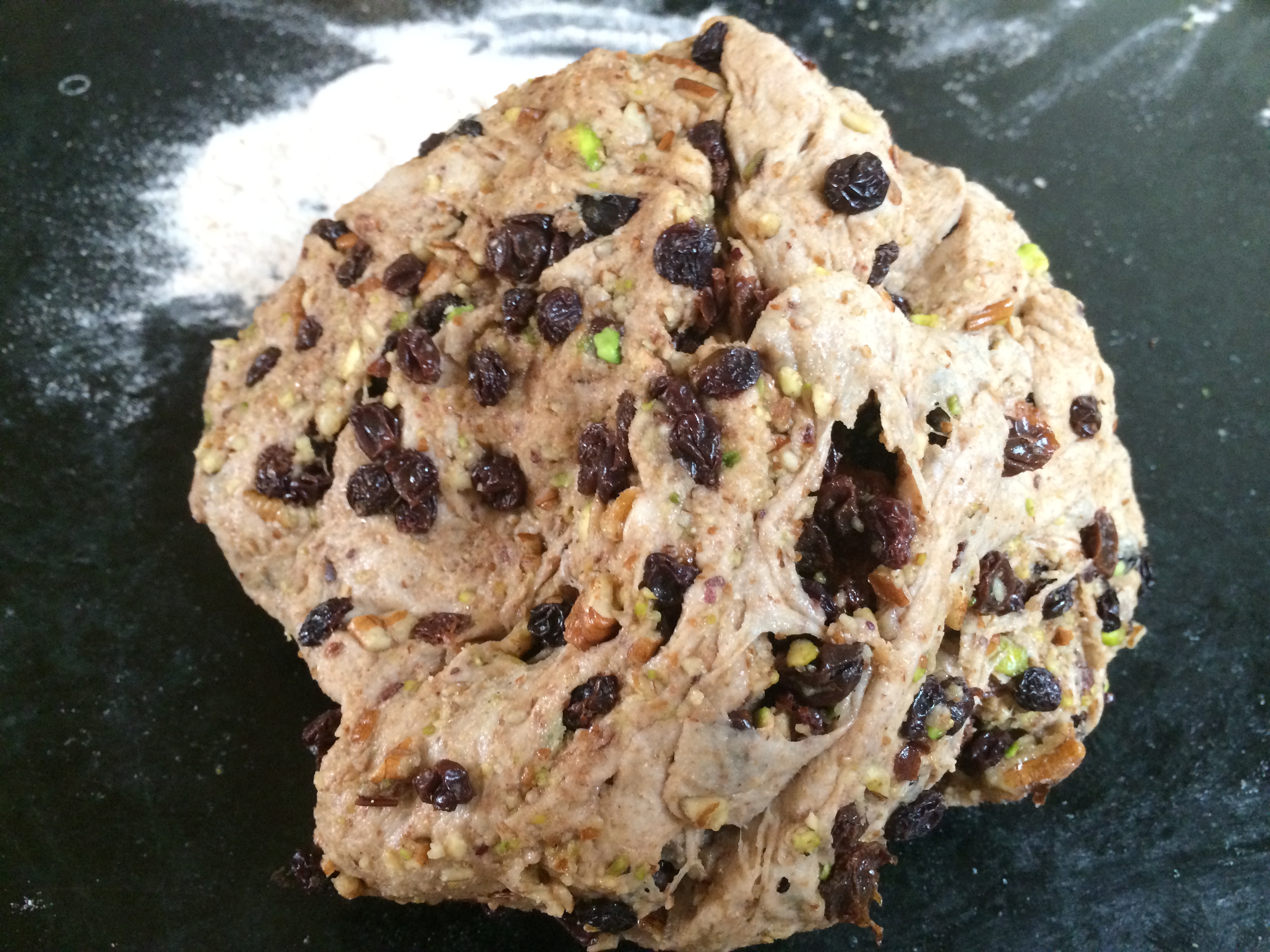 You do need to knead it lightly after, just to get it all to combine. At this point nuts and raisins might start falling out of your dough ball, just do your best to tuck them back in.