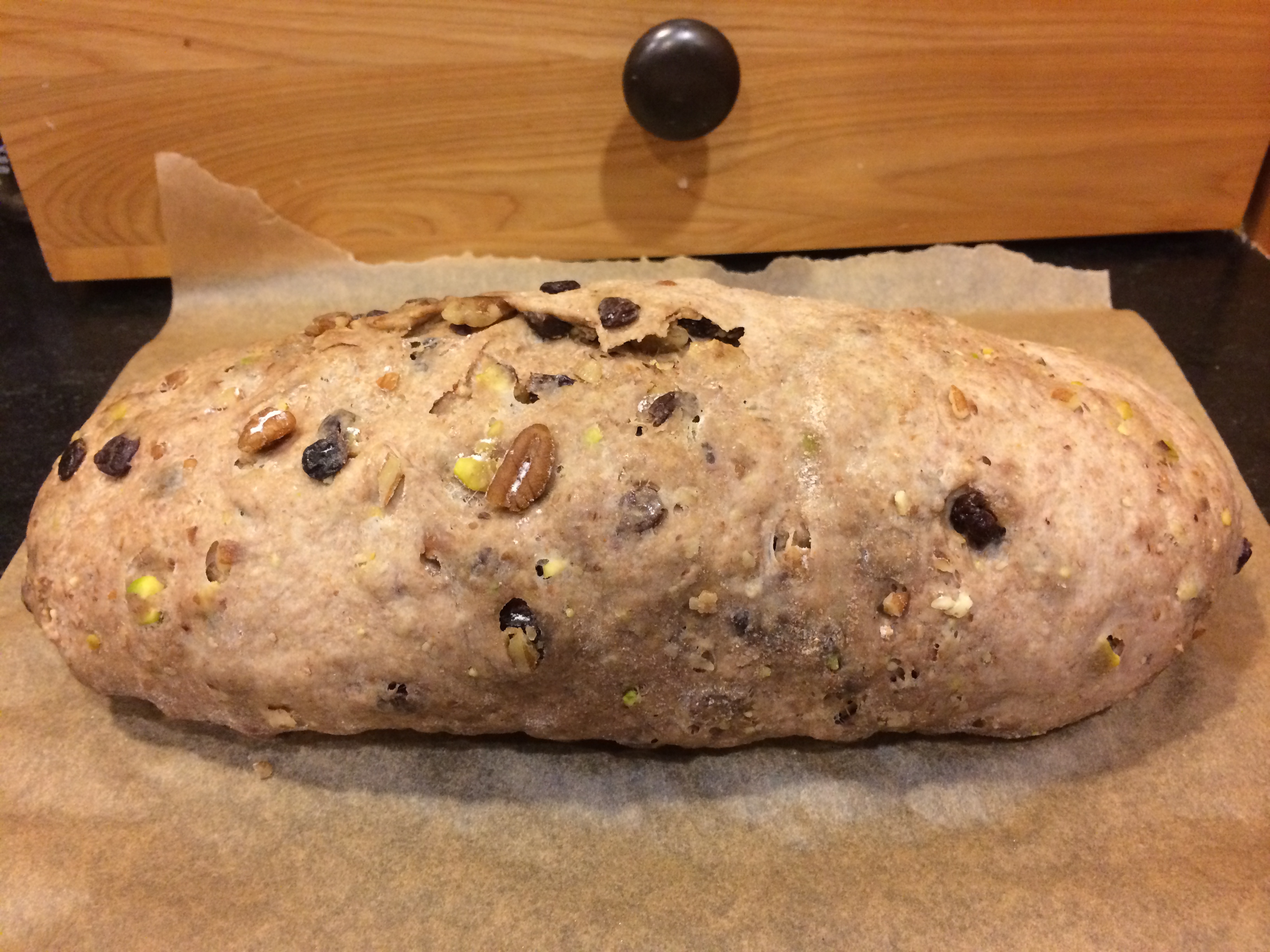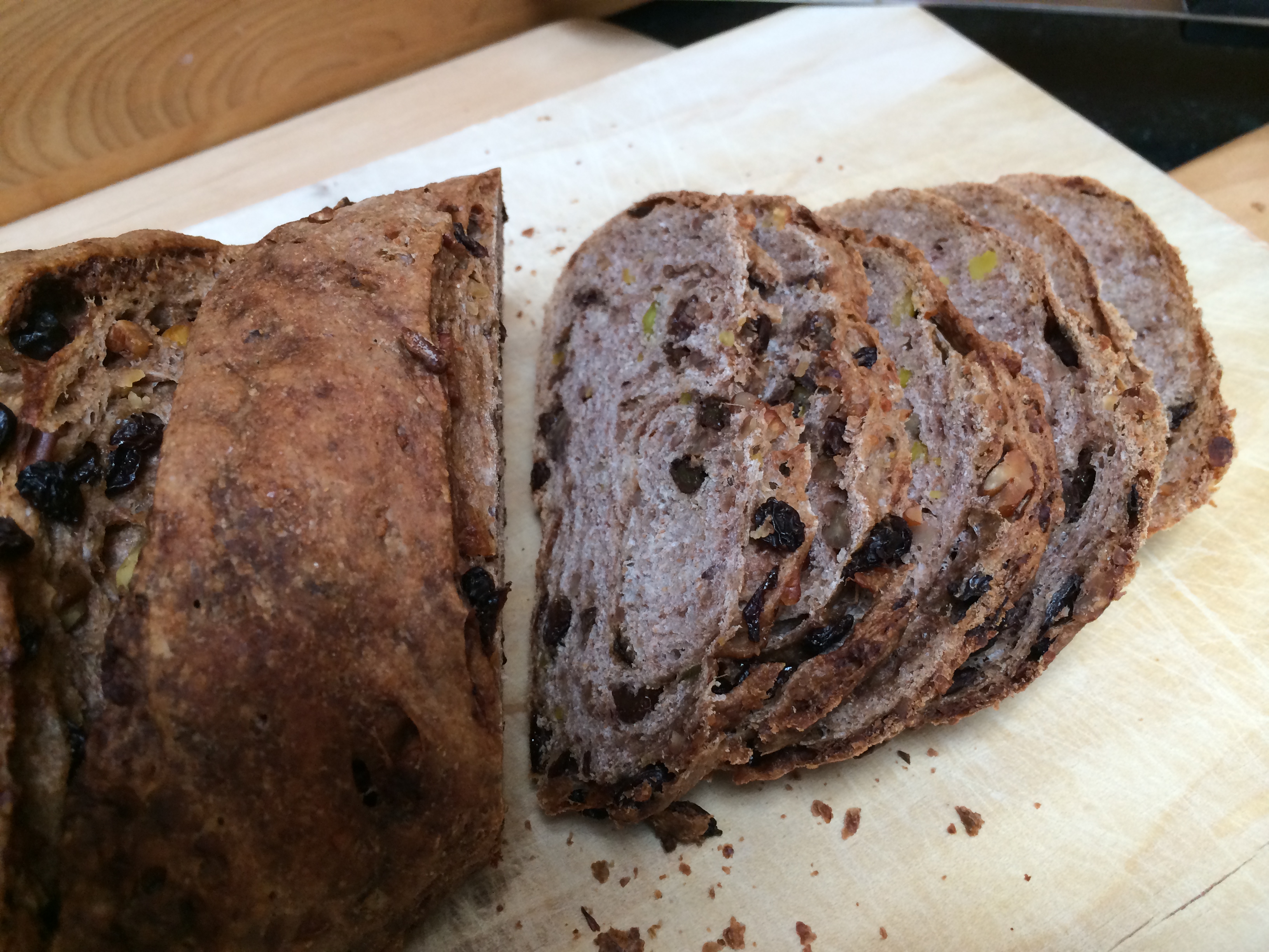 I have made several of the breads in her book The Bread Bible, and this one is one of my favorites. Of course breads with raisins and nuts are quite common. But the standard configuration they come in is the sliced bread with a square shape, sprinkled with cinnamon and a swirl in the middle. Now that is wonderful, but there’s more to raisin-nut breads than the cinnamon swirl.