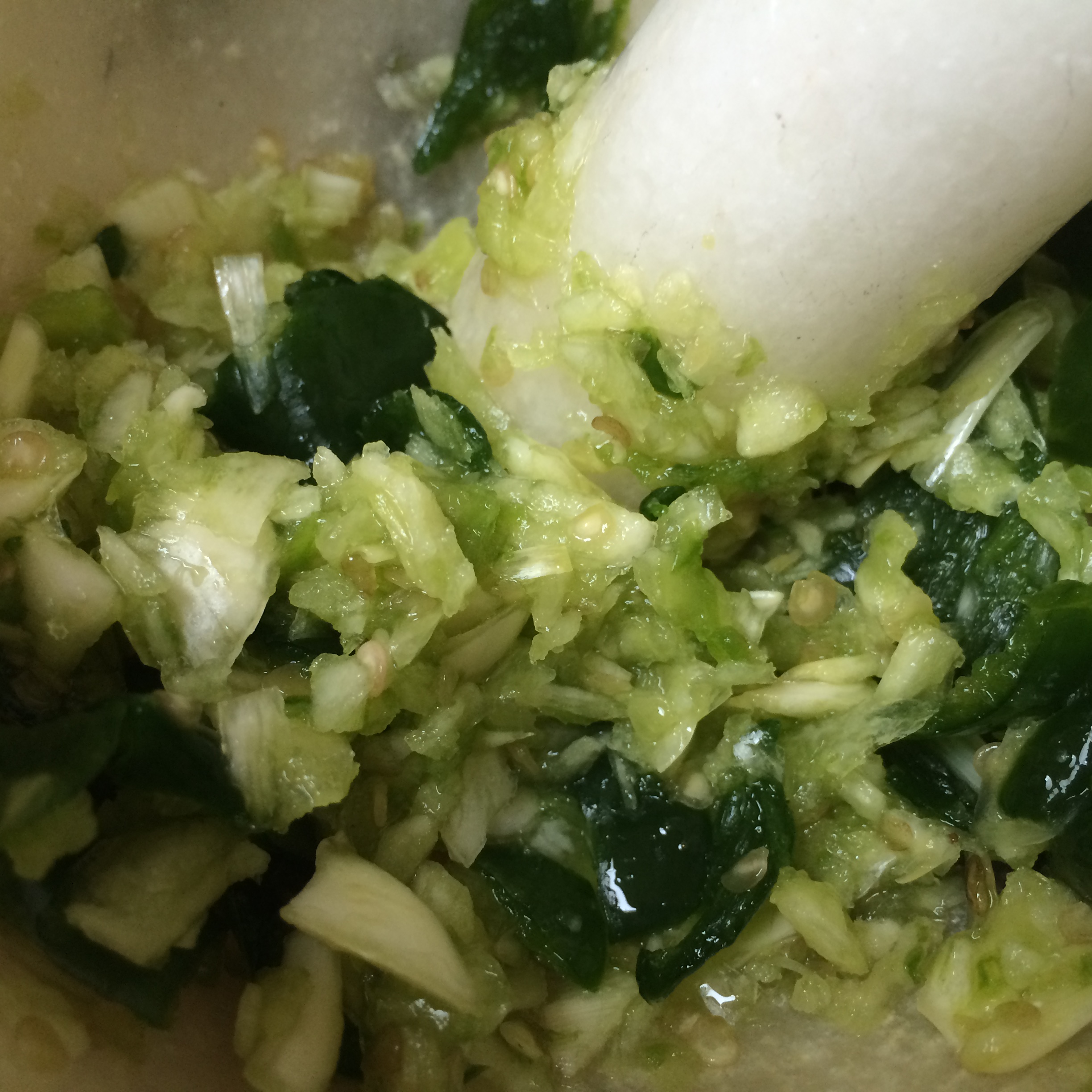 The spices tend to be a similar set. Fennel seed is congenial, and so is the use of nigella seed. Turmeric powder has antiseptic properties so that is always used, and the heat comes from red chilies. Usually, the spices are left whole, this time, I chose to pulverize them a bit. They went from looking like this to this: