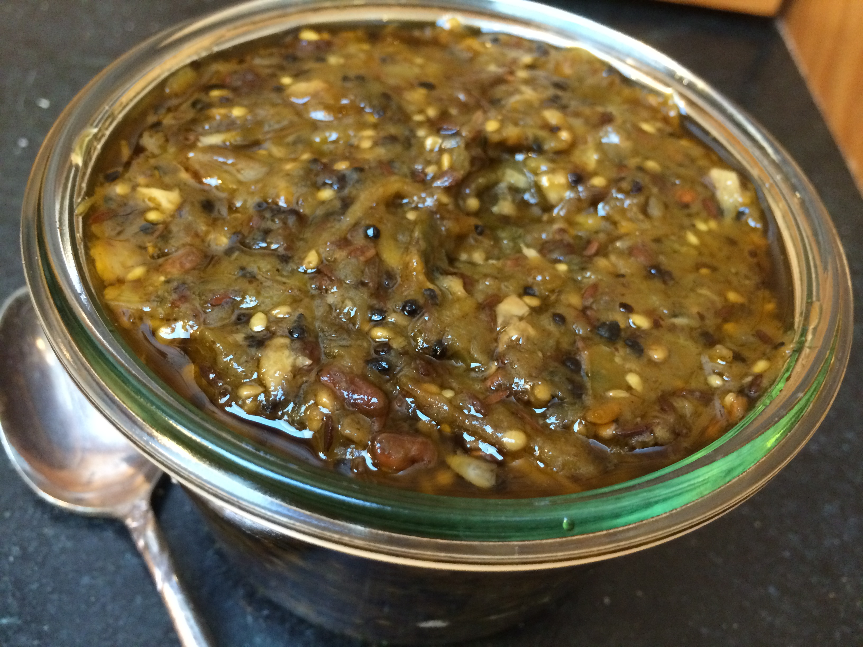 Transfer to a scrupulously clean glass jar (you can sterilize it in boiling water first if you like, I didn’t). Pack it down. Pour some of the mustard oil over it and wait for it to settle; pour more. Do this in a few stages, until a thin film of oil shines over the very top of the jar. For me, it took about half a cup. Cover and store in the pantry.