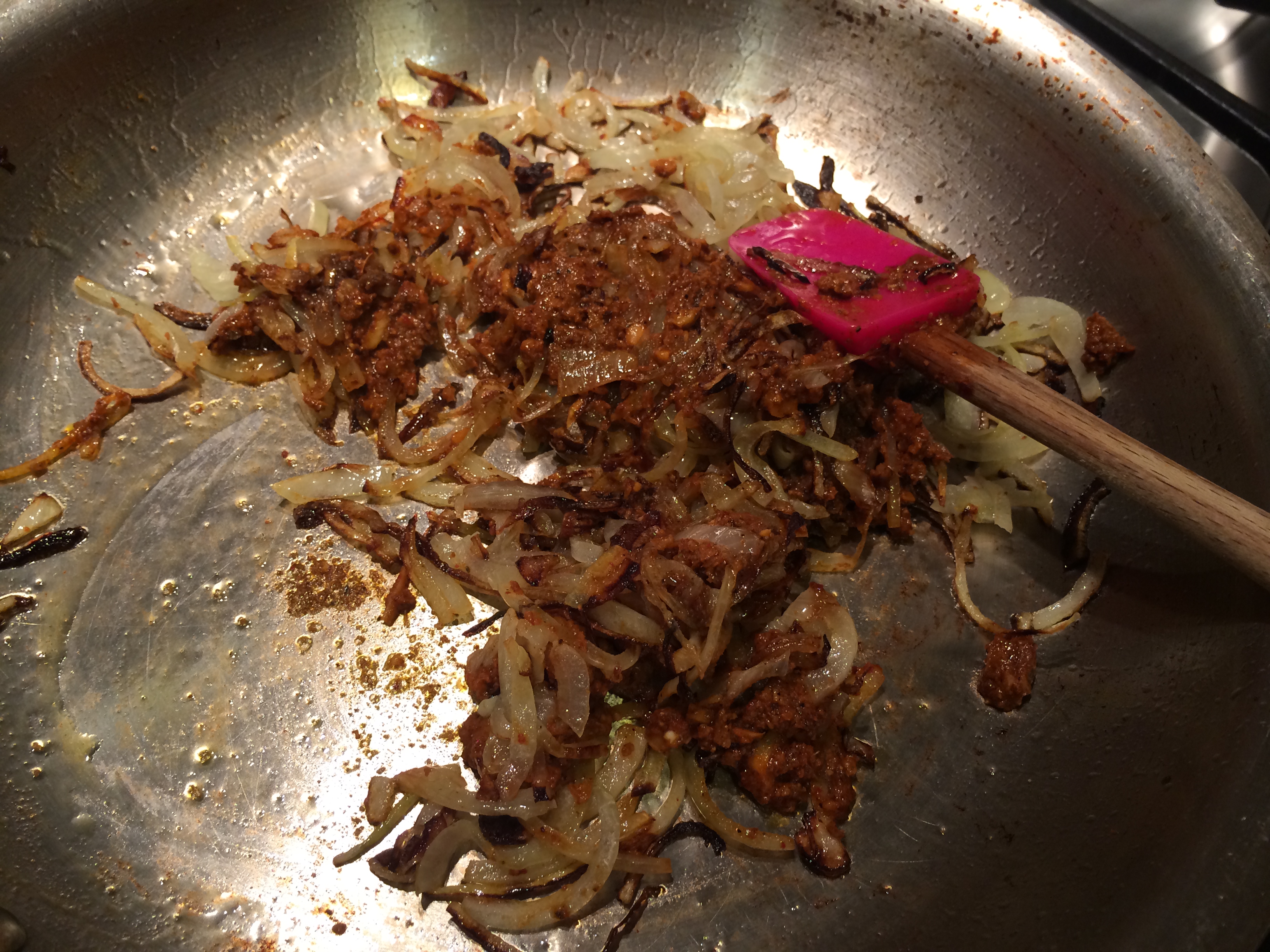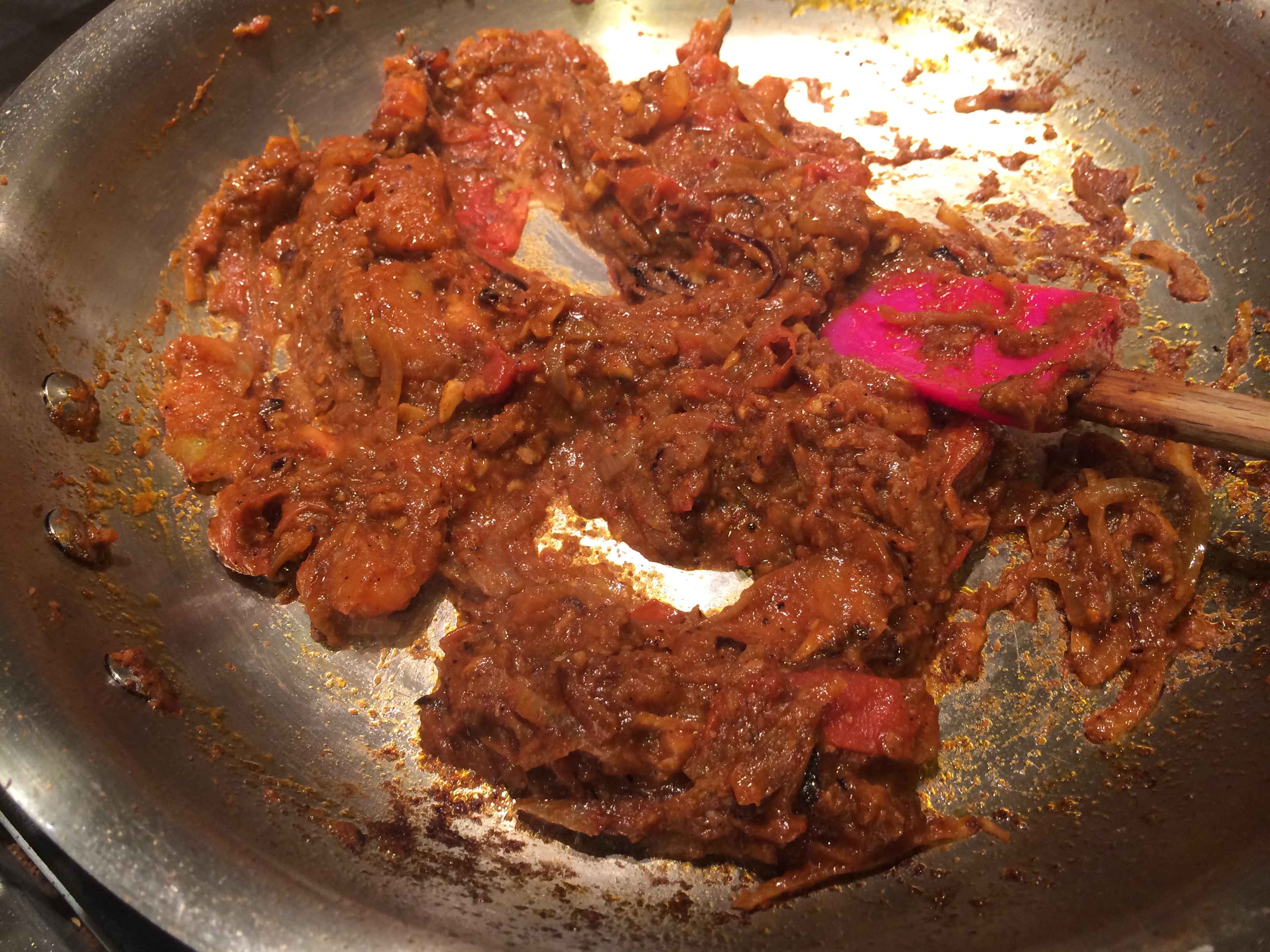 Slice the onions thinly and fry in the oil until somewhat browned. Read this for the proper method. Put in the Malvani masala at this point and stir and cook it on medium heat for a few minutes. Dice the tomatoes and put those in. Let them cook to the point they liquefy and dry up.