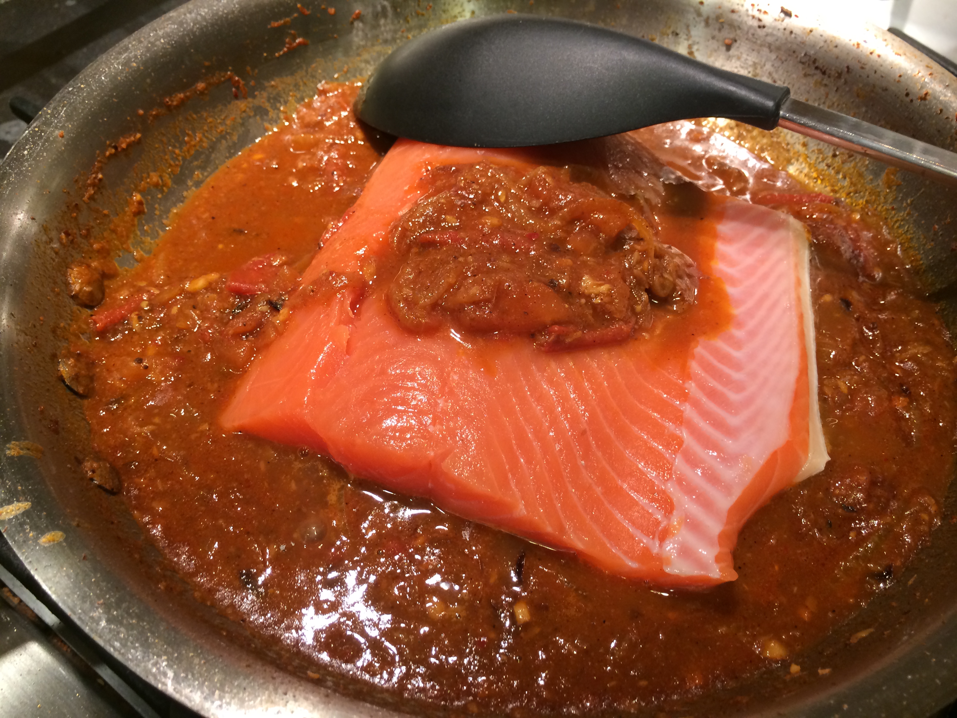 I call bullshit on that. We are in the interwebs, people, and the Moving Finger can do what it damn well pleases. So it did. I used my Malvani spice paste to make a nicely-flavored gravy in which I floated some salmon; but I also used the opportunity to tighten up my ingredients list for the spice paste itself. So a post from months ago has been updated with more precise amounts and, ahem, better formatting. Check it out. Take that, Omar.