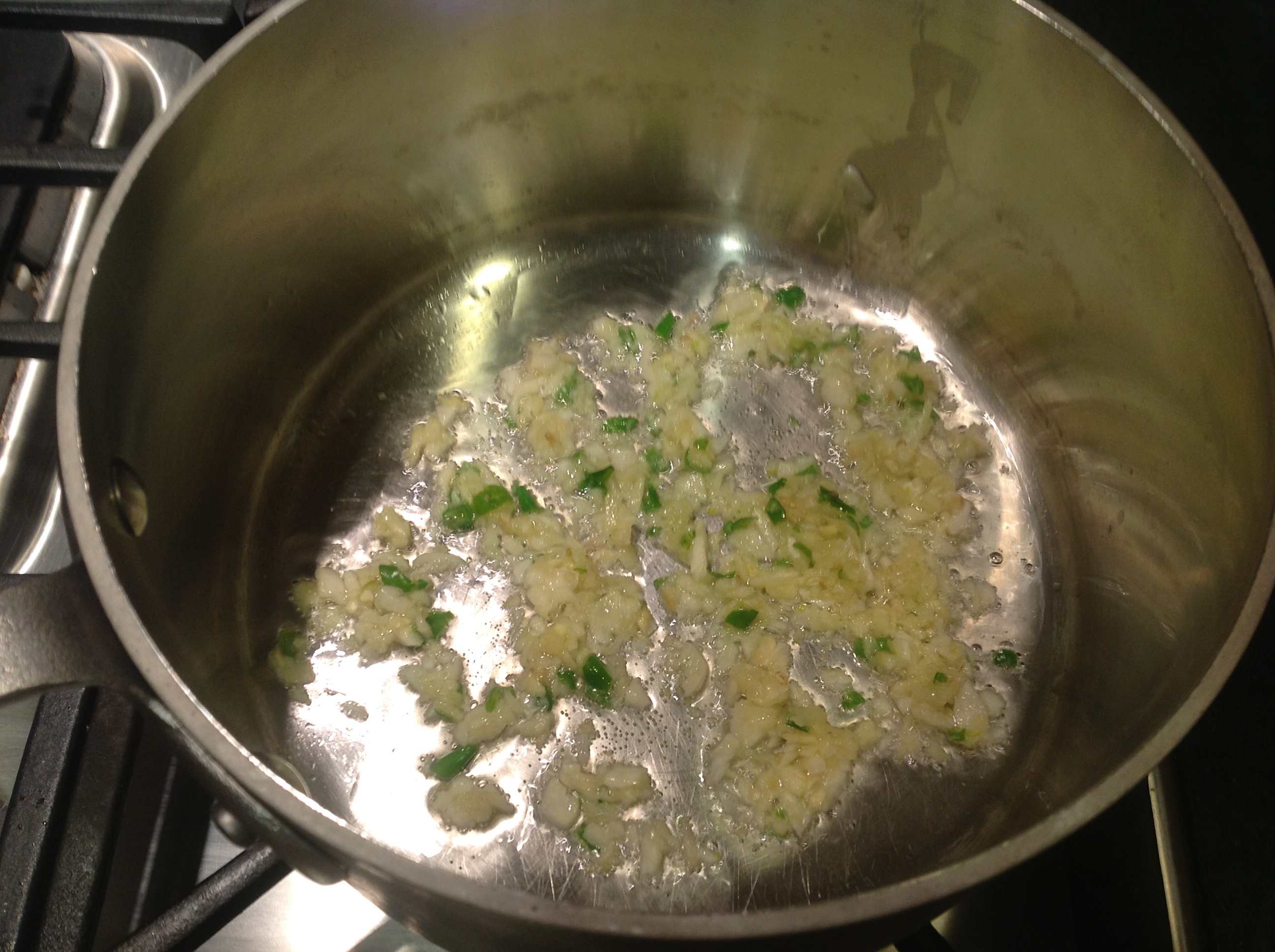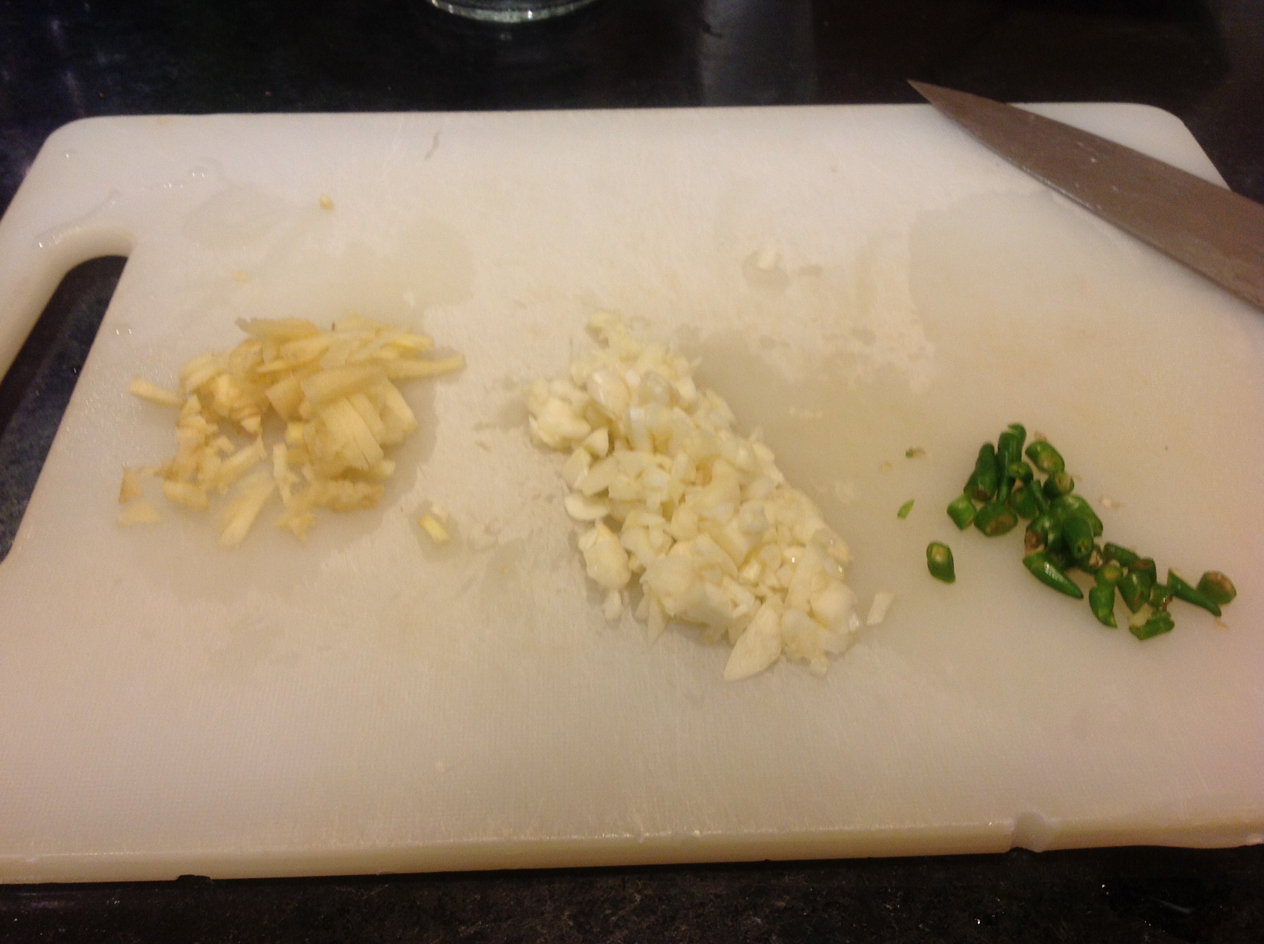 Chop the garlic, ginger and chili. Give them a pounding in a mortar and pestle after sprinkling a bit of salt on it to add a bit of roughage and to draw out moisture.