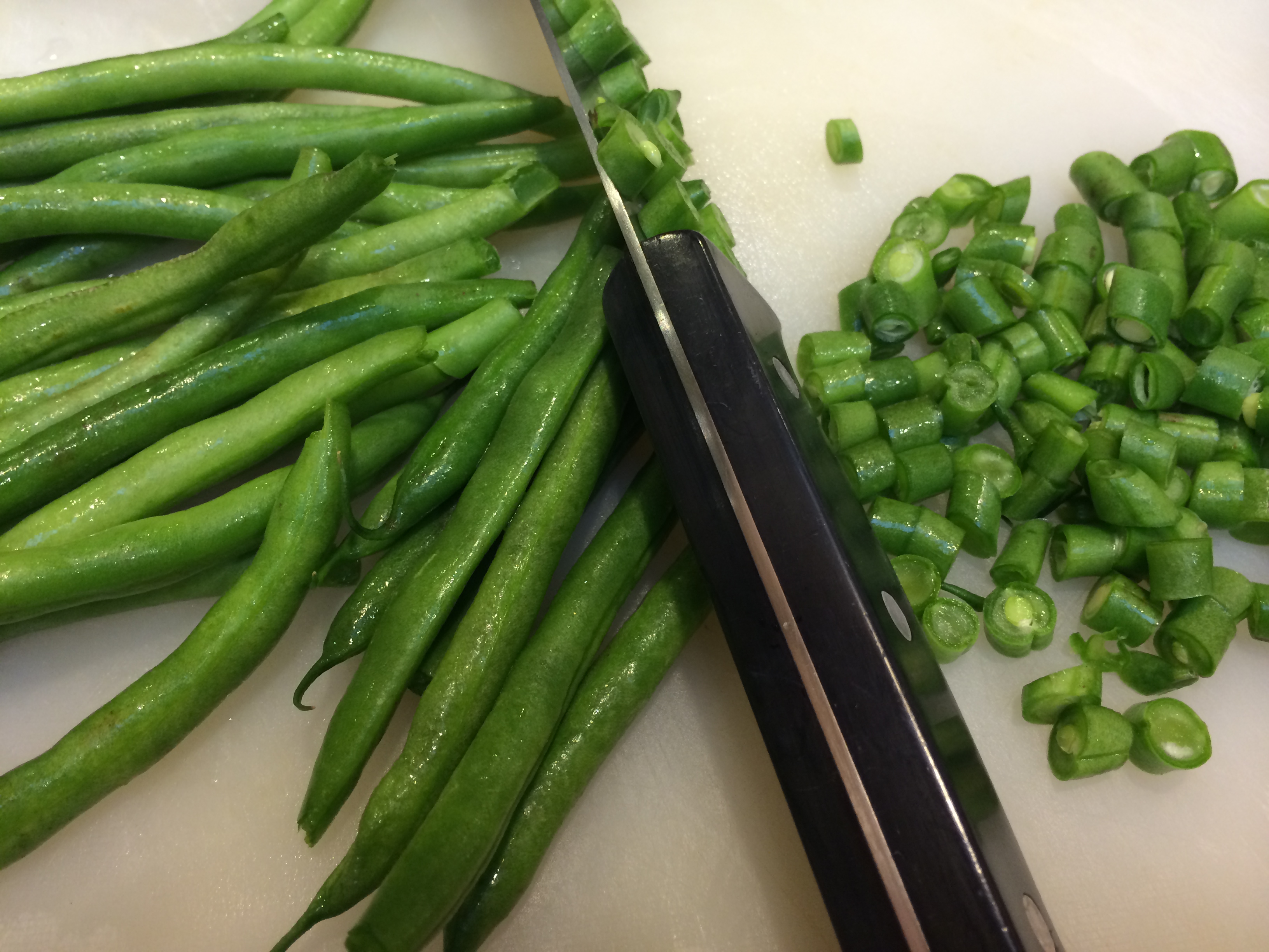 Make a paste of the garlic, fresh chilies and anchovies in a mortar and pestle. Takes about 7 minutes, not too bad. Wash, trim and slice the winged beans lengthwise. If you are using green beans or asparagus, just trim them and leave them intact.