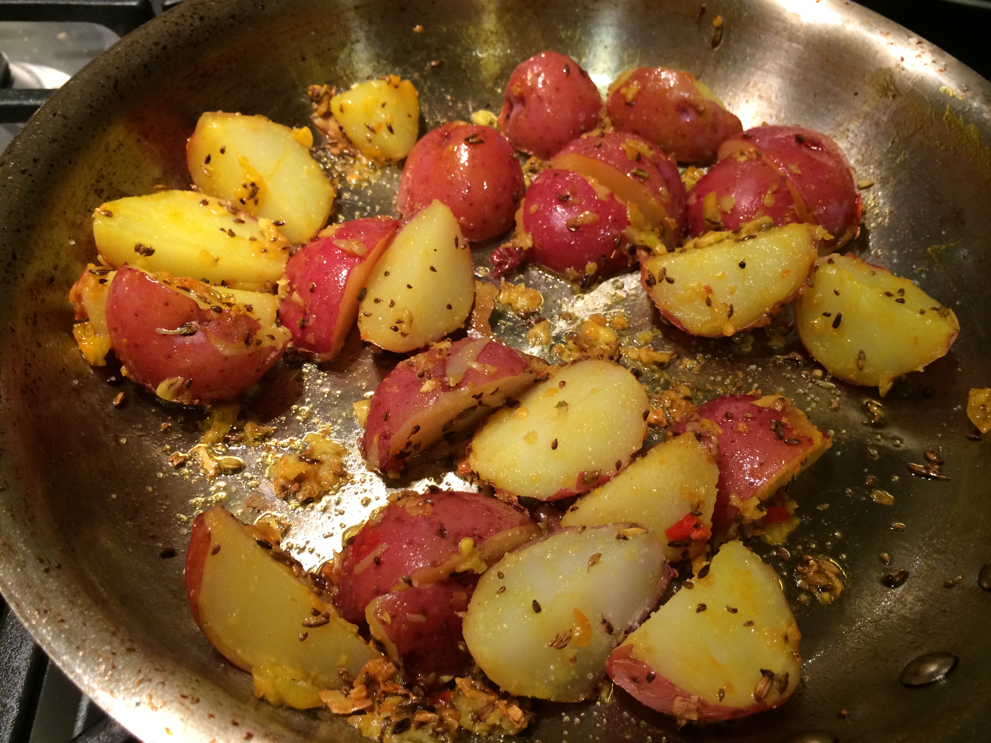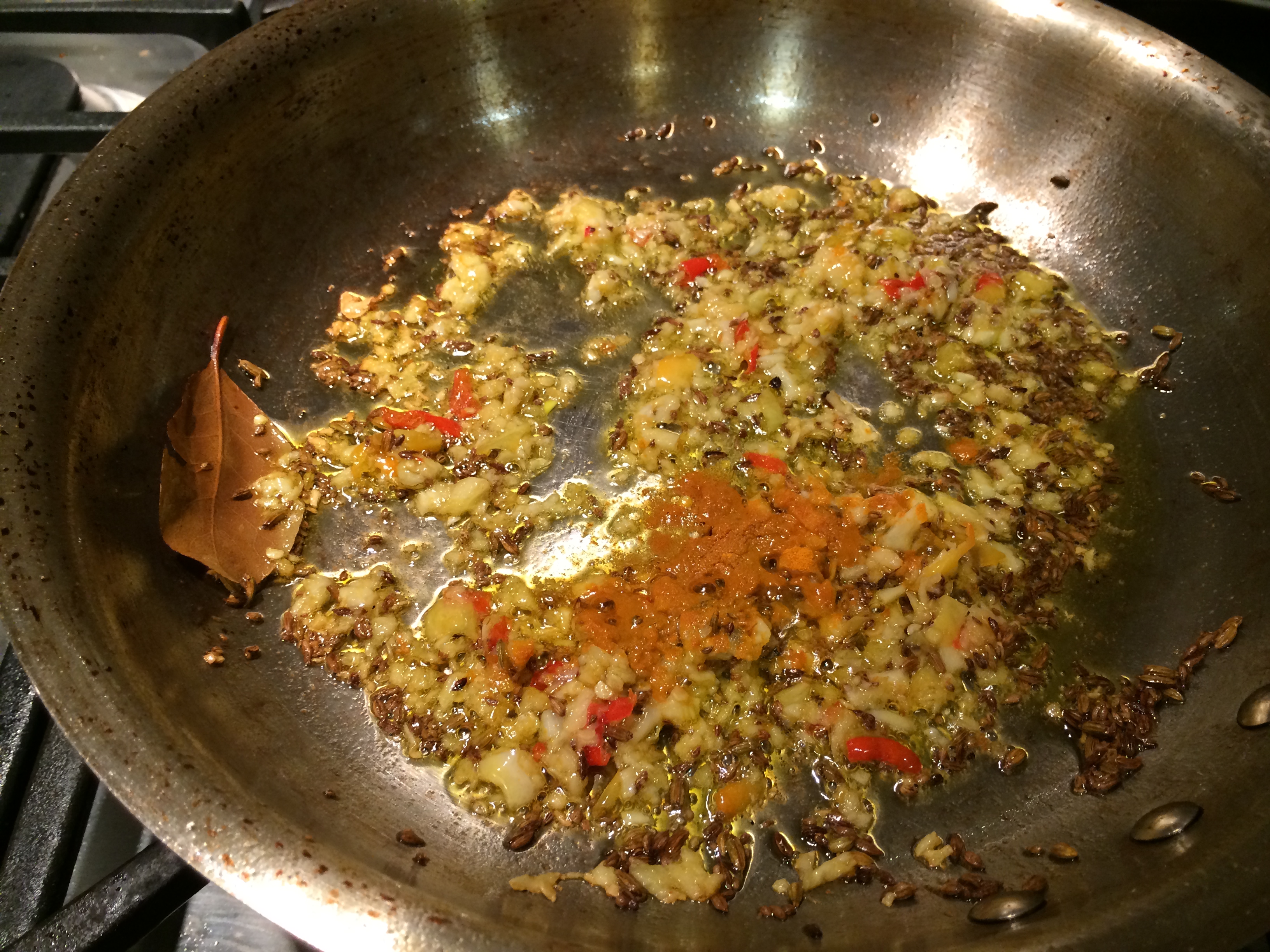To make the parathas you can refer to this recipe, but I’m including most of the steps anyway. The dough is the same as used for rotis/chapatis. Roll out a thin circle about 5-6 inches wide. Place a couple tablespoons of the filling in the middle. Gather up the edges of the disk into a pouch. Flatten the pouch with your fingers, then roll it out again carefully so as to prevent the filling from escaping. Once it is a flat disk once again, about an eighth of an inch thick, it is time to shallow-fry on the griddle.