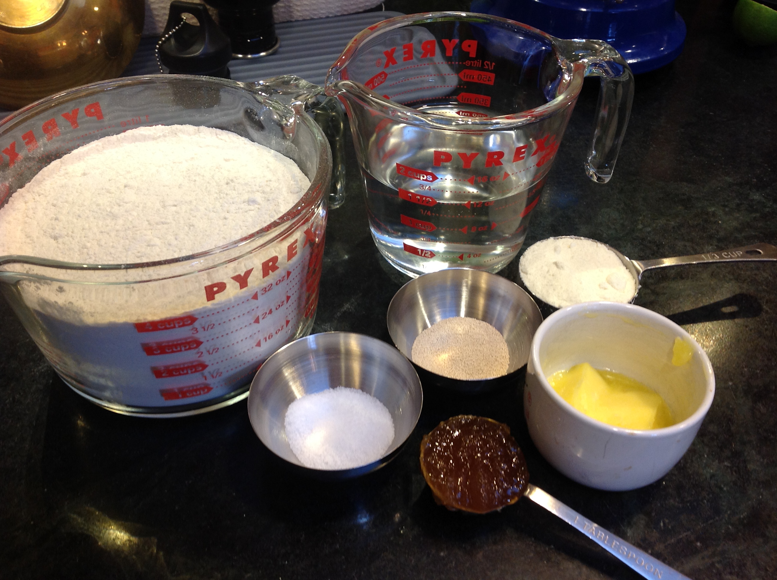 - 3 cups flour (I used 2.5 cups King Arthur bread flour and 0.5 cups King Arthur whole wheat flour)