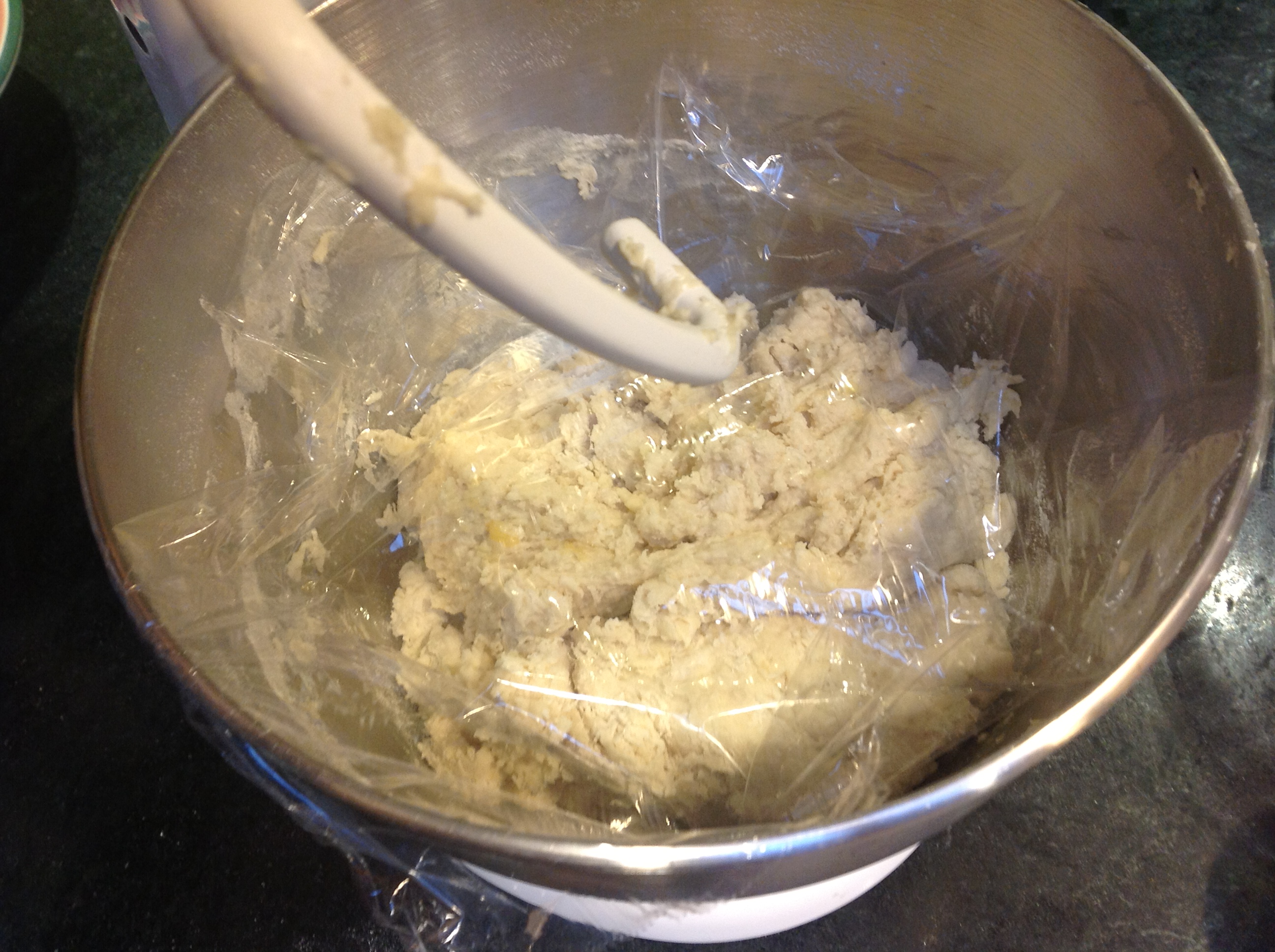 The resulting mixture will be very, very rough and sticky. Scrape down the sides of the bowl with a spatula, wrap tightly with plastic wrap and leave aside.