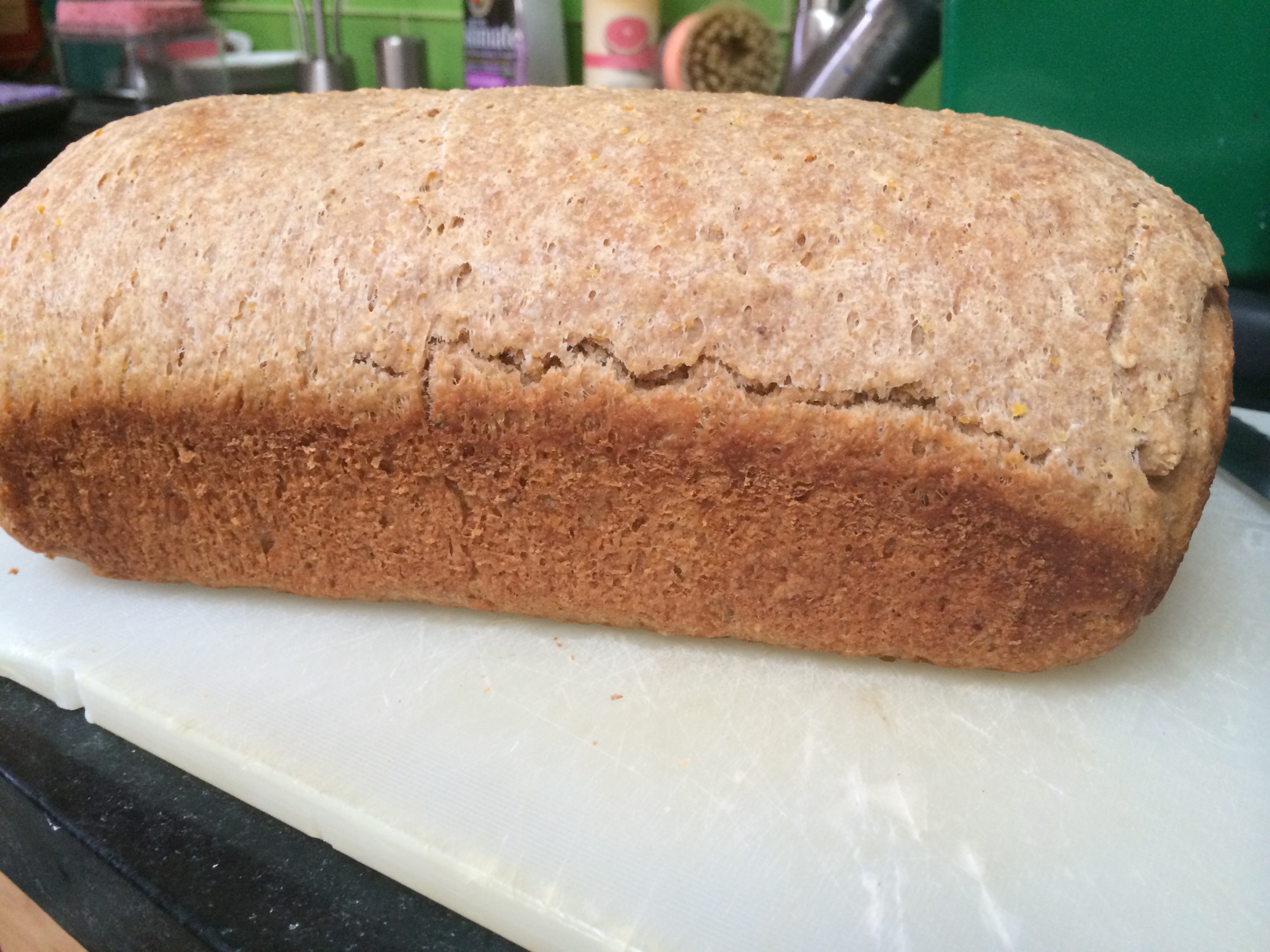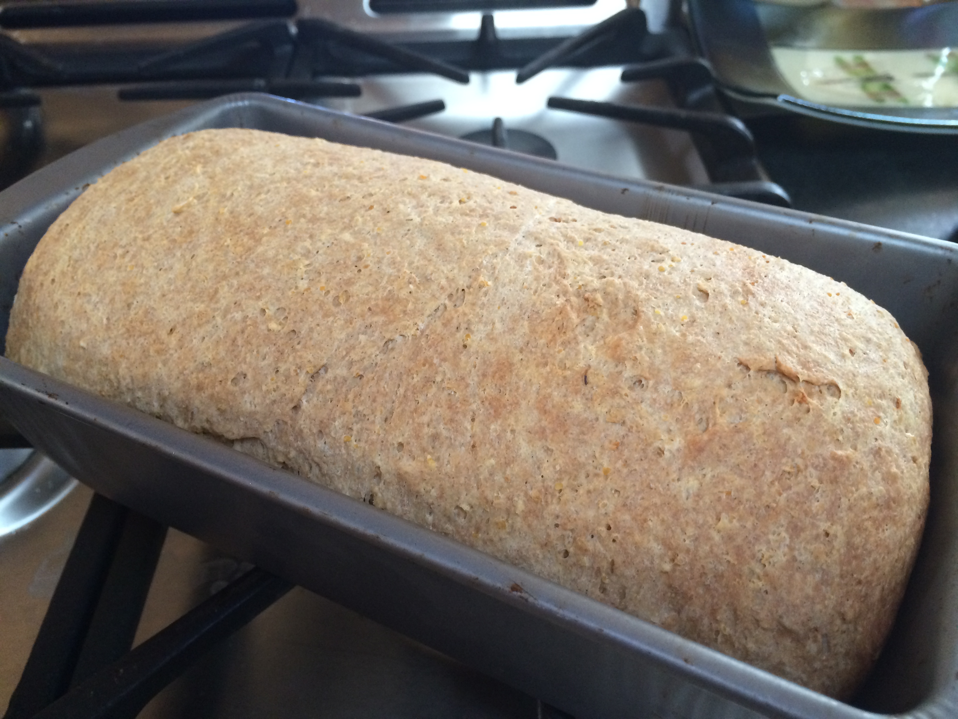 At the end of baking, the crust should be golden brown and the bread dramatically risen. When thumped on the bottom it will sound hollow. Let it cool for an hour before slicing.