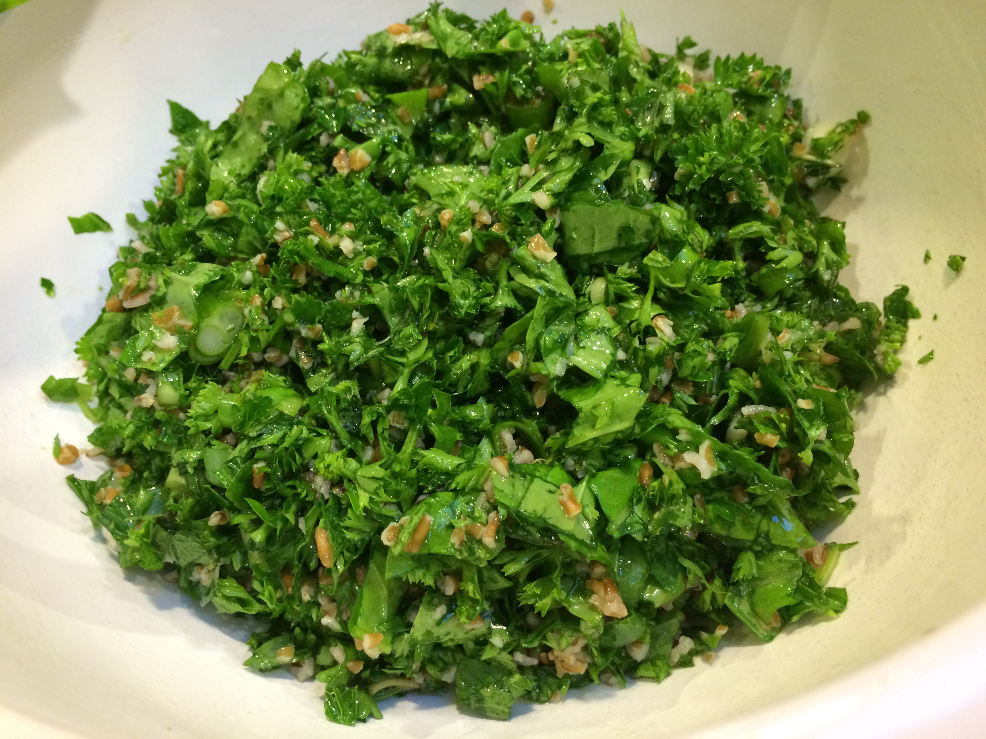 The resulting mixture will be very, very rough and sticky. Scrape down the sides of the bowl with a spatula, wrap tightly with plastic wrap and leave aside.